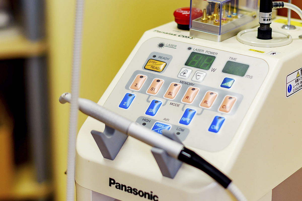 歯科では外科処置に歯科用レーザーを使用して治療を行うことがあります。当院では、歯科用レーザーを用いて、歯肉のメラニン除去や口内炎の治療を行っています。